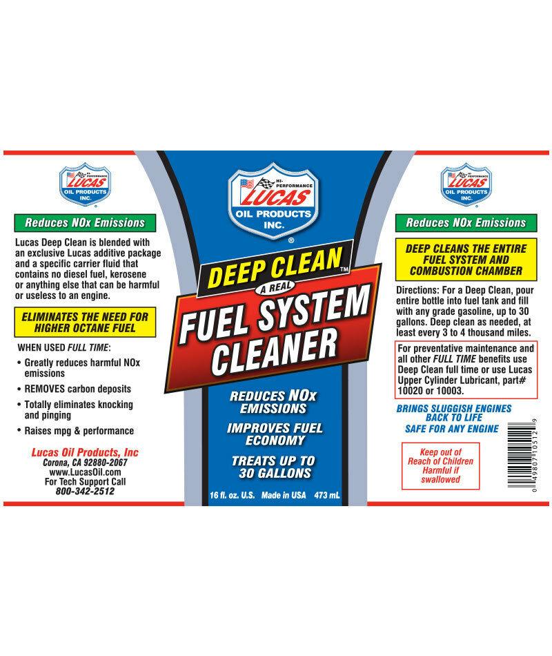 Lucas Deep Clean is blended with an exclusive Lucas additive package and specific carrier fluid that contains no diesel fuel, kerosene or anything else that can be harmful or useless to an engine. It also reduces NOx emissions, eliminates the need for higher octane fuel and deep cleans the entire fuel system and combustion chamber.