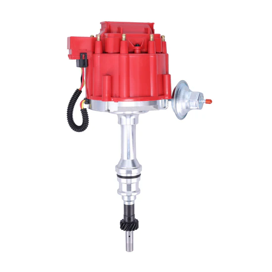 High quality brass terminals and a protective plastic dust cover that encapsulates the 65,000-volt coil. A new cast-aluminum housing featuring a machine polished finish contains new bushings, main shaft assembly, and a hardened steel gear. Our HEI includes high-output module, centrifugal advance components, and adjustable vacuum advance canister.
